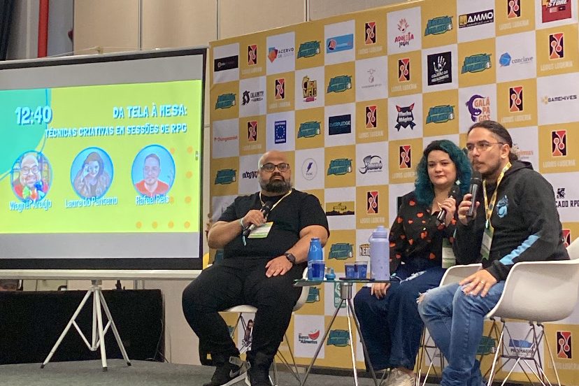 Além de visitar estandes, comprar coisas, me encontrar com amigos e distribuir humildemente meu trabalho (e assinar ele), uma outra coisa que fiz bastante foi ver palestras sobre RPG de mesa. As duas que fui foram “Da tela à mesa: Técnicas criativas em sessões de RPG” e “Mestre como os mestres: Os pilares para um bom RPG”. Valeu super a pena ter assistido as duas, foi bom poder escutar de mestres experientes conhecimento que poderia aplicar em minhas mesas para melhorar ainda mais aspectos narrativos, mecânicos e aumentar a diversão de todos na mesa (algo muito valioso para mim pela minha presença em eventos como mestre de RPG e levando minhas aventuras para outros conhecerem).
