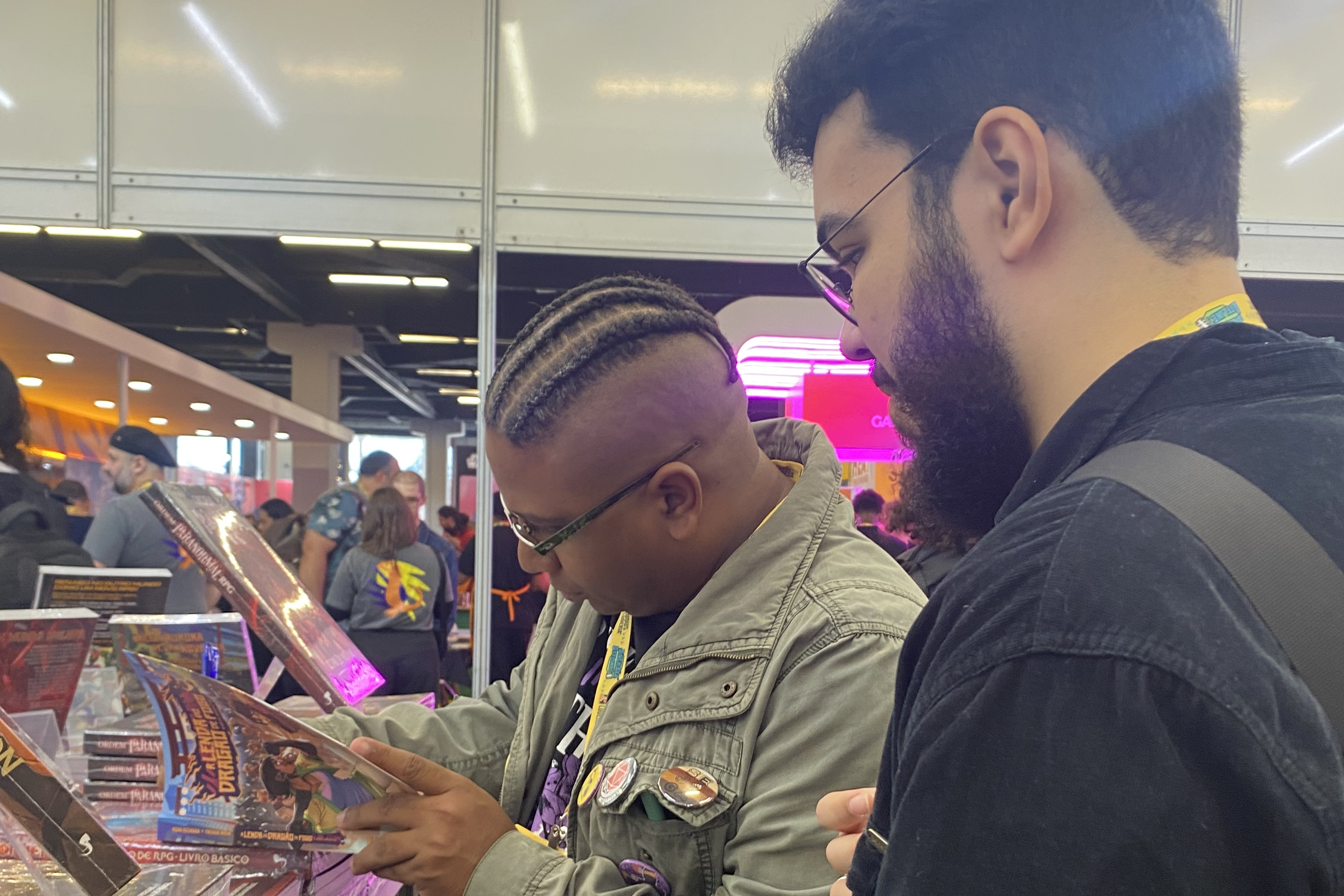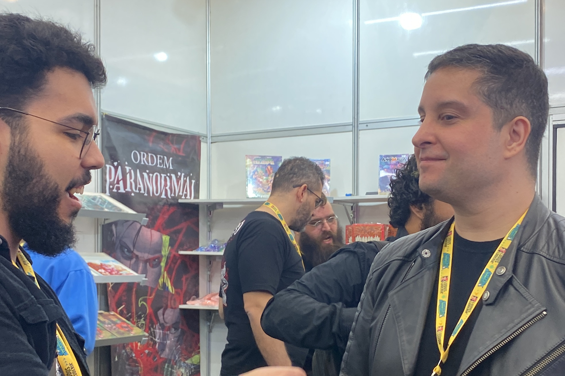Uma parada obrigatória para mim em eventos nerds desse tipo (que sou extremamente viciado em Tormenta depois que comecei a conhecer mais sobre ele) é ir no estande da Jambô. E esse encontro seria ainda mais especial, visto os acontecimentos recentes em relação ao Rio Grande do Sul. Para mim foi um misto do que sempre sentia ao ver eles e também o pensamento de “caralho, não consigo imaginar quão difícil foi para aqueles que estavam no estado passaram”. Mesmo sendo de Teresópolis, que também passou por uma tragédia climática em 2011, tudo que eu imaginasse não faria jus a realidade.